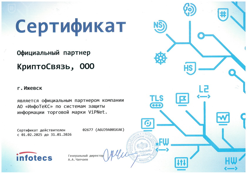 ОАО «Инфотекс Интернет Траст» (Москва) Оказание услуг по построению защищенных виртуальных частных сетей на основе технологии ViPNetтм и других видов сервиса, требующих решения вопросов защиты информации |